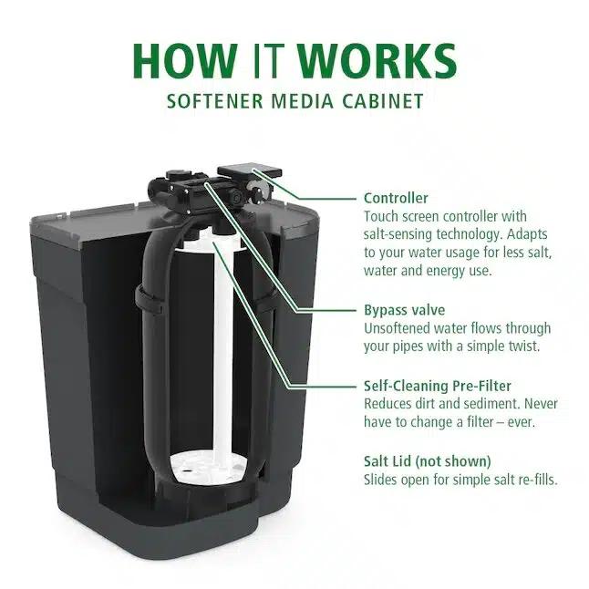 This includes such traits as having a single cabinet space-saving design (encapsulates the resin and salt tank), a touch screen controller with salt sensing and water usage technology, using an efficient salt ion exchange water softening process, and having an included kit that makes installation easy (with bypass valve). These softeners are also known for having fast and quiet regeneration.