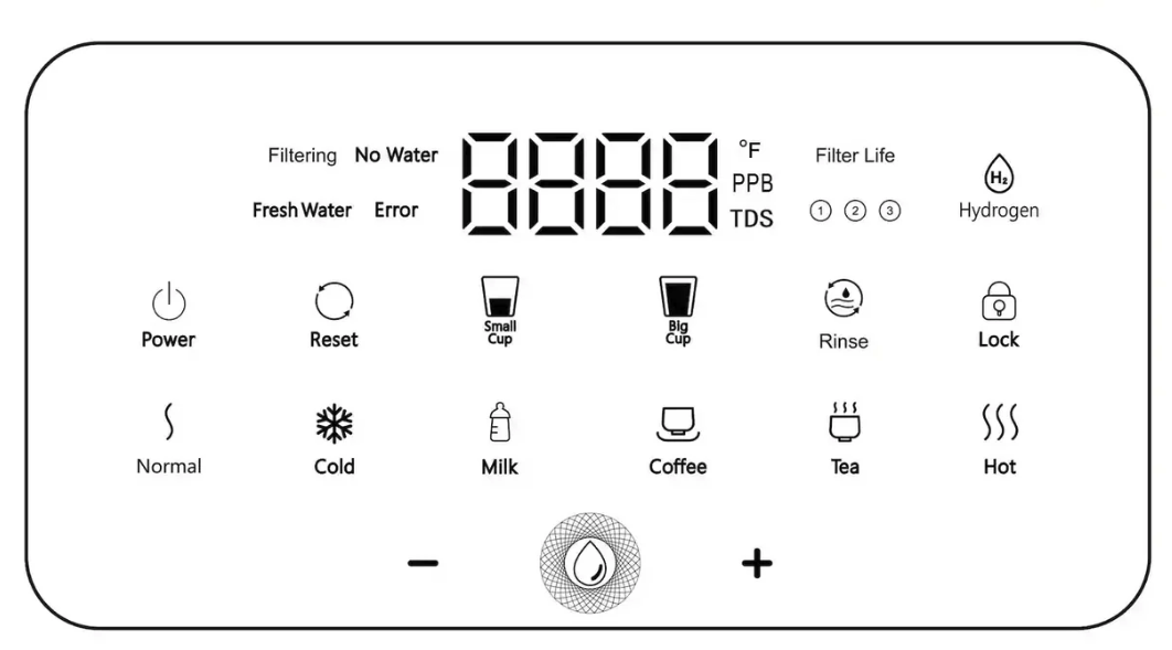 | Display | The system includes an intelligent touch control panel, which displays the status of the filter and other relevant information, including: active filtering, refill supply tank, water temp, volume, hydrogen content, TDS, water cooler, filter life, fresh water refill, and system errors. |